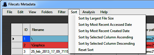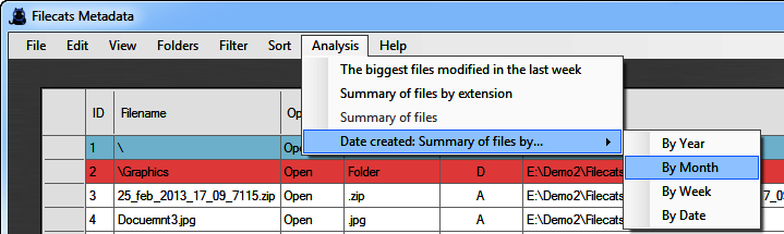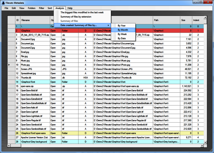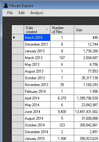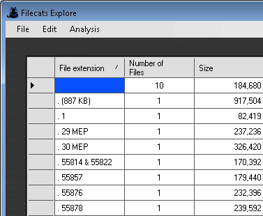 The table can be filtered beforehand, so that analyses can be done on a reduced list. For example, if you had filtered on Word documents by filtered on all extensions starting with .doc, then any analyses will only be done on these Word documents.