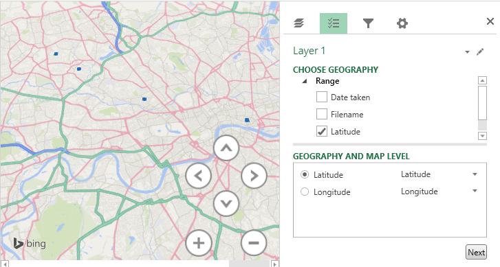 Latitude and Longitude have already been mapped correctly, but Date Taken has not been mapped. Clicking Next allows you to map to Height, Category and Time. Dragging Date Taken into Time correctly associates this field.