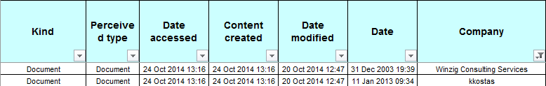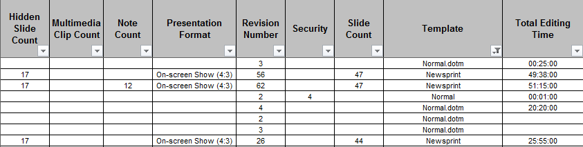 The video below shows how quickly and easily document properties can be cataloged. An example spreadsheet generated by the metadata extractor Filecats Professional of several thousand Microsoft Office files is below: