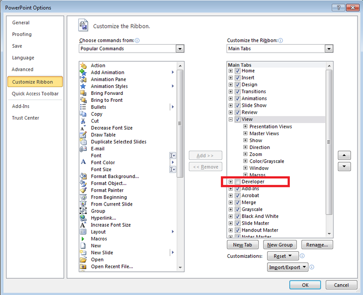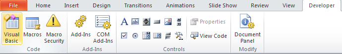 (If you cannot see the Developer tab, go to File - Options - Customize Ribbons, and check the box marked "Developer" in the right-hand column.)